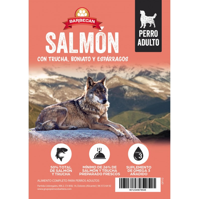 Salmón y Trucha 50% (incluyendo Salmón y Trucha Preparados Frescos 36%, Salmón Deshidratado 12% y Caldo de Salmón 2%), Boniato (24%), Guisantes (9%), Patata, Pulpa de Remolacha, Semillas de Lino, Suplemento de Omega 3, Minerales, Vitaminas, Caldo de Verduras, Espárragos (0,3%), FOS (96 mg/kg), MOS (24 mg/kg)
